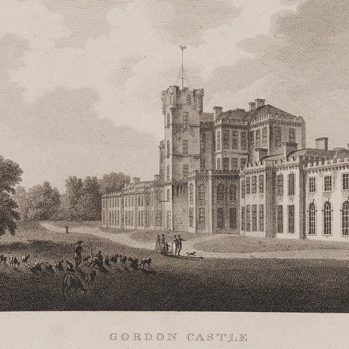Located in Gight, near Fochabers a place which historically is known as the Bog-of-Gight, Gordon Castle was the principal seat of the Dukes of Gordon. Following 18th-century redevelopment, it became one of the largest country houses ever built in Scotland, although much has since been demolished. The original castle was built by George Gordon, 2nd Earl of Huntly in the 1470s and enlarged by his grandson. John Adam (architect) was commissioned with the French architect Abraham Roumieu to redesign the castle in 1764 but this did not come to fruition. Eventually the commission fell to the lesser-known Edinburgh architect, John Baxter, who rebuilt it in 1769 for Alexander Gordon, 4th Duke of Gordon. The central four storey block incorporated a six-storey medieval tower called the Bog-of-Gight, and was flanked by a pair of two-storey wings. The main facade was 568 feet (173 metres) long. Most of the castle has been demolished, but the Bog-of-Gight and one of the wings—now a detached medium sized country house in its own right—survive.