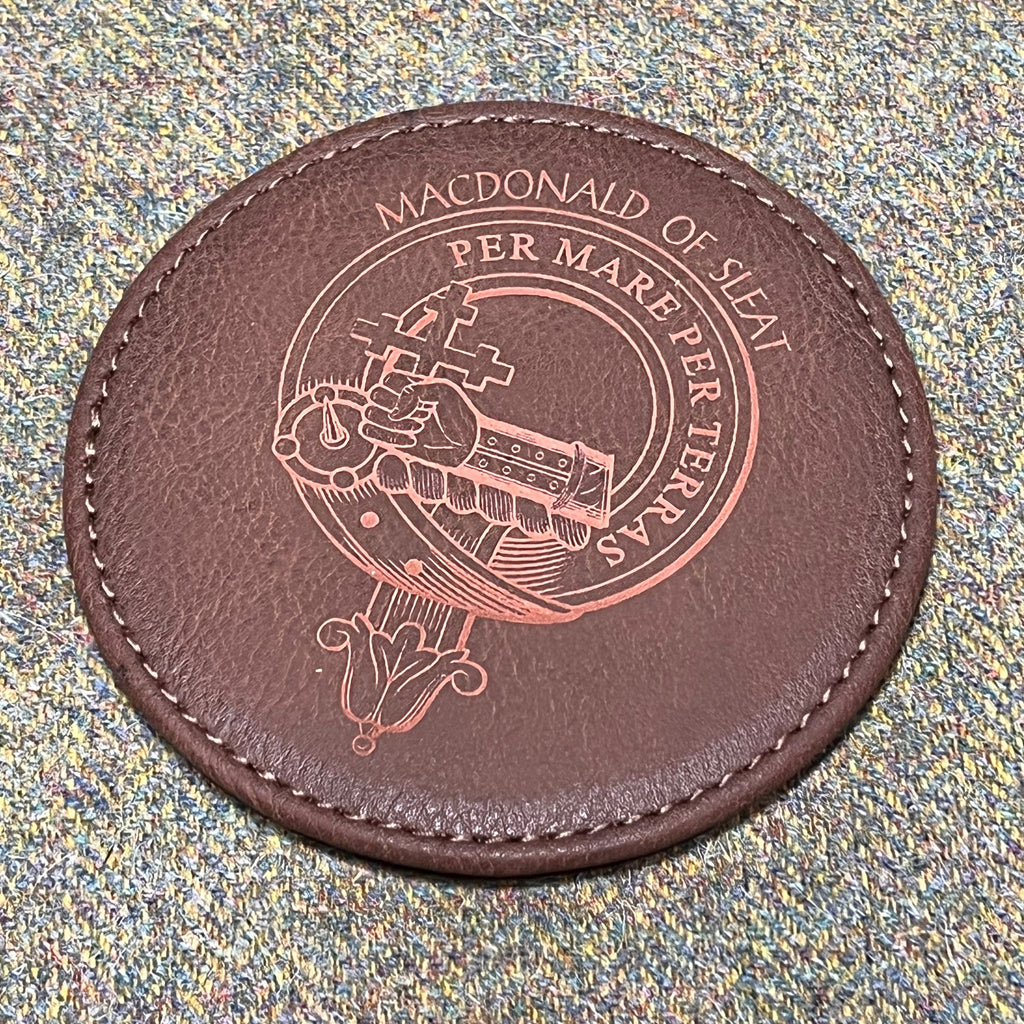 Leather effect coaster with clan crest engraved on the surface - any clan. discounts for packs of 4.