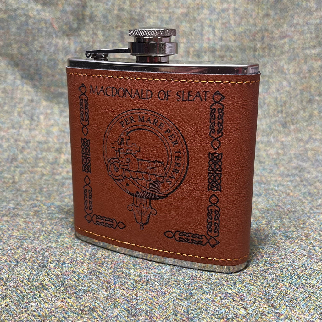 6oz Stainless Steel Hip Flask with clan crest laser engraved on the leather effect surface.