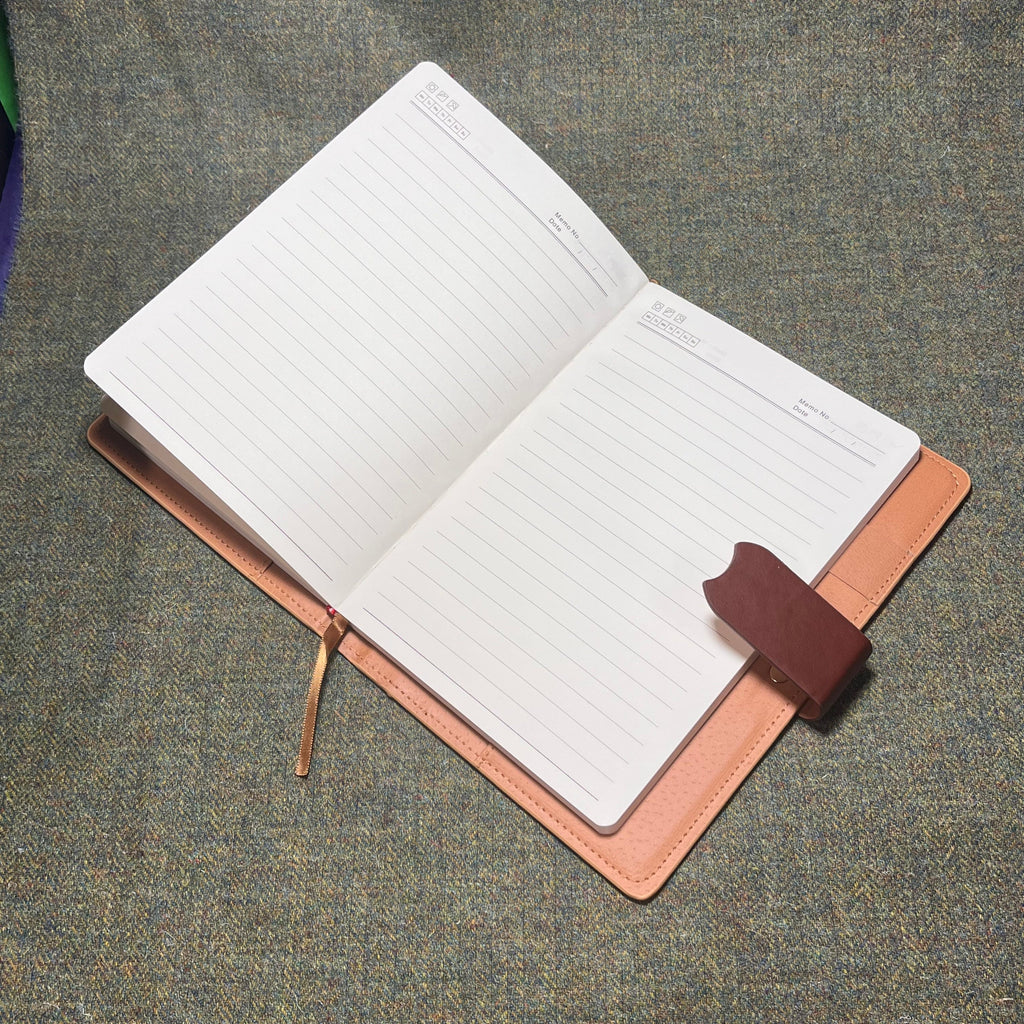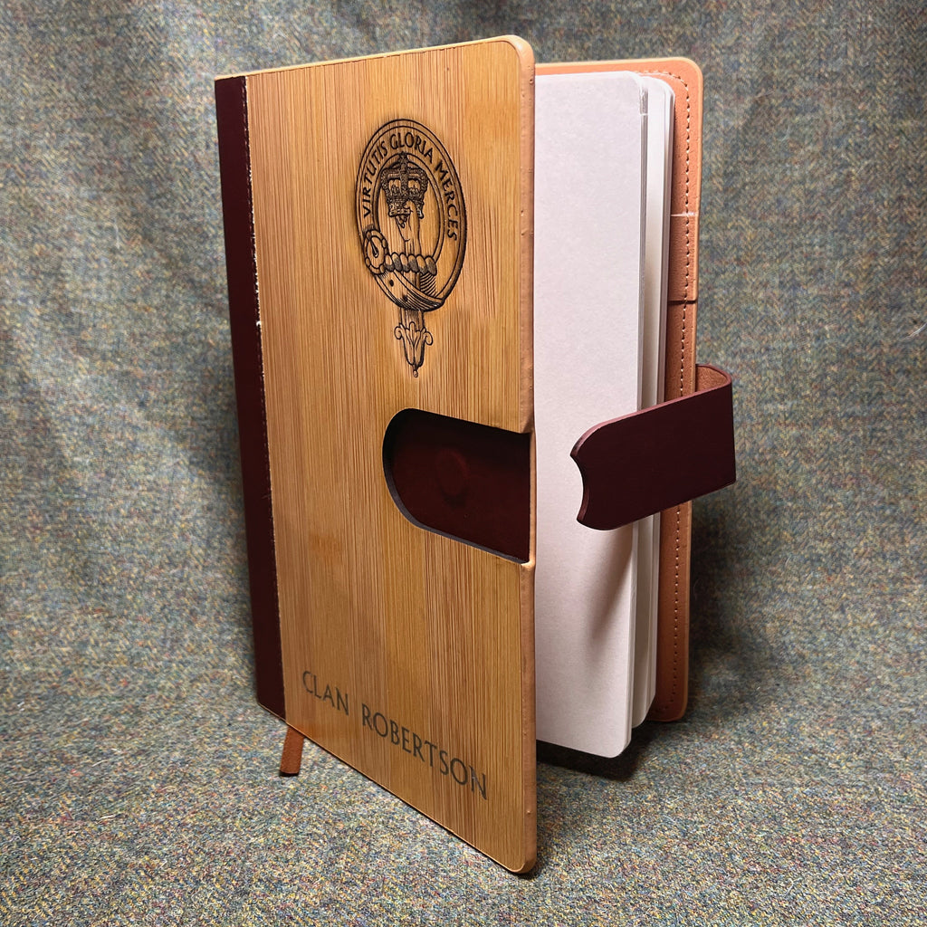With a leather and bamboo cover this lovely notebook will be laser engraved with your choice of clan crest. Magnetic catch, inside wallet has space for credit cards inside. Notebook paper is lined. Cover size 14.5cm X 22cm . Spelling variations are available please add a note or contact us first.
