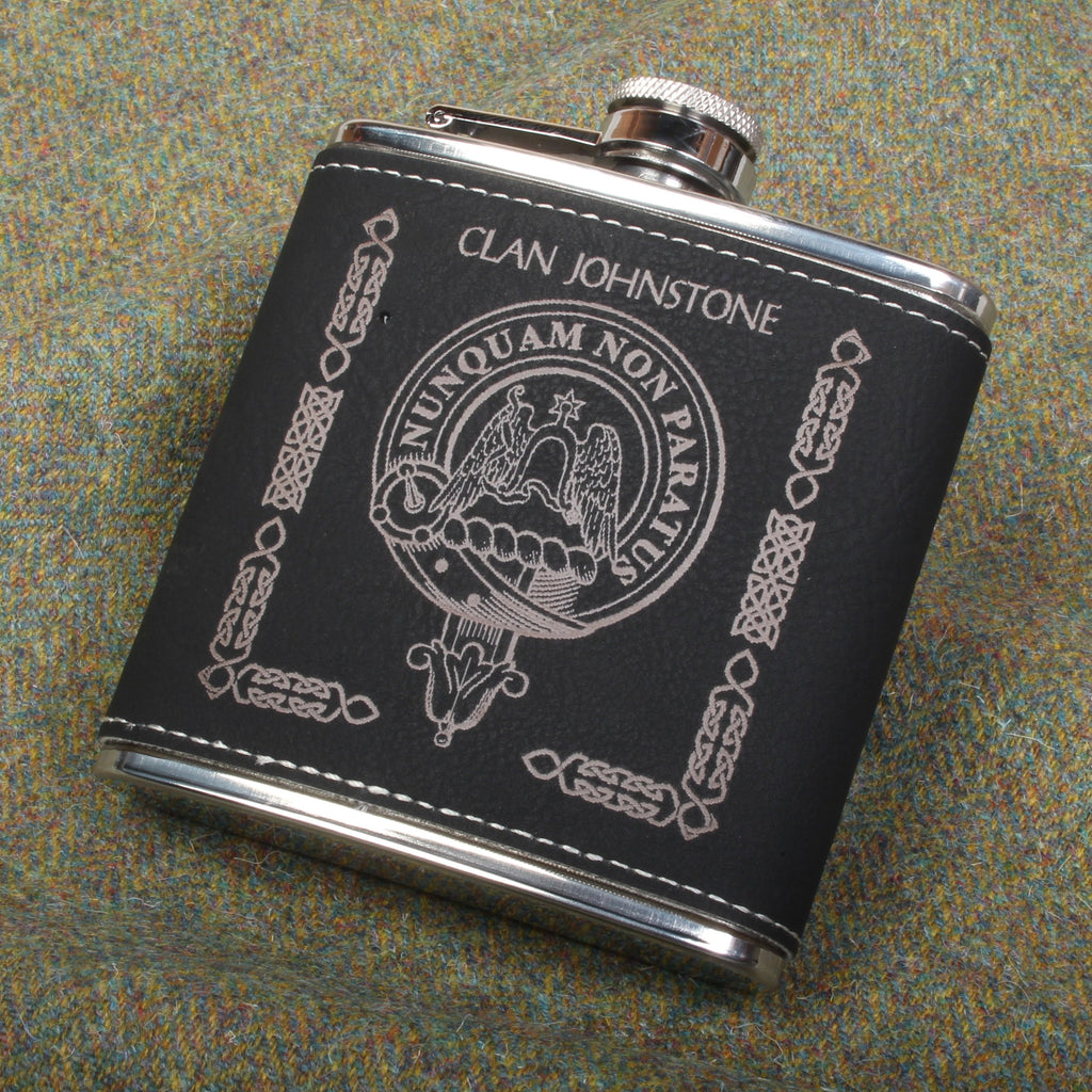Fantastic 6oz Stainless Steel Hip Flask with Black PU leather cover - laser engraved with your Clan Crest.