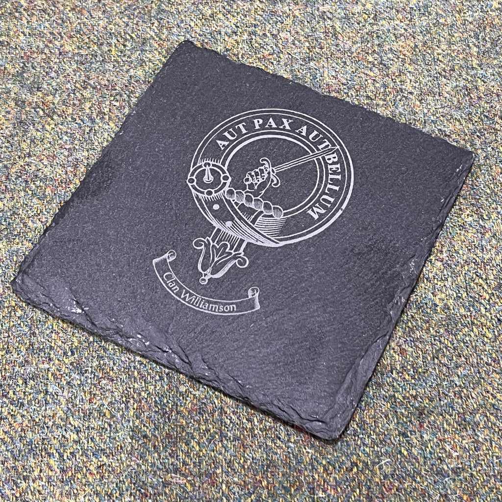 Real slate coaster with clan crest engraved on the surface - any clan. discounts for packs of 4.