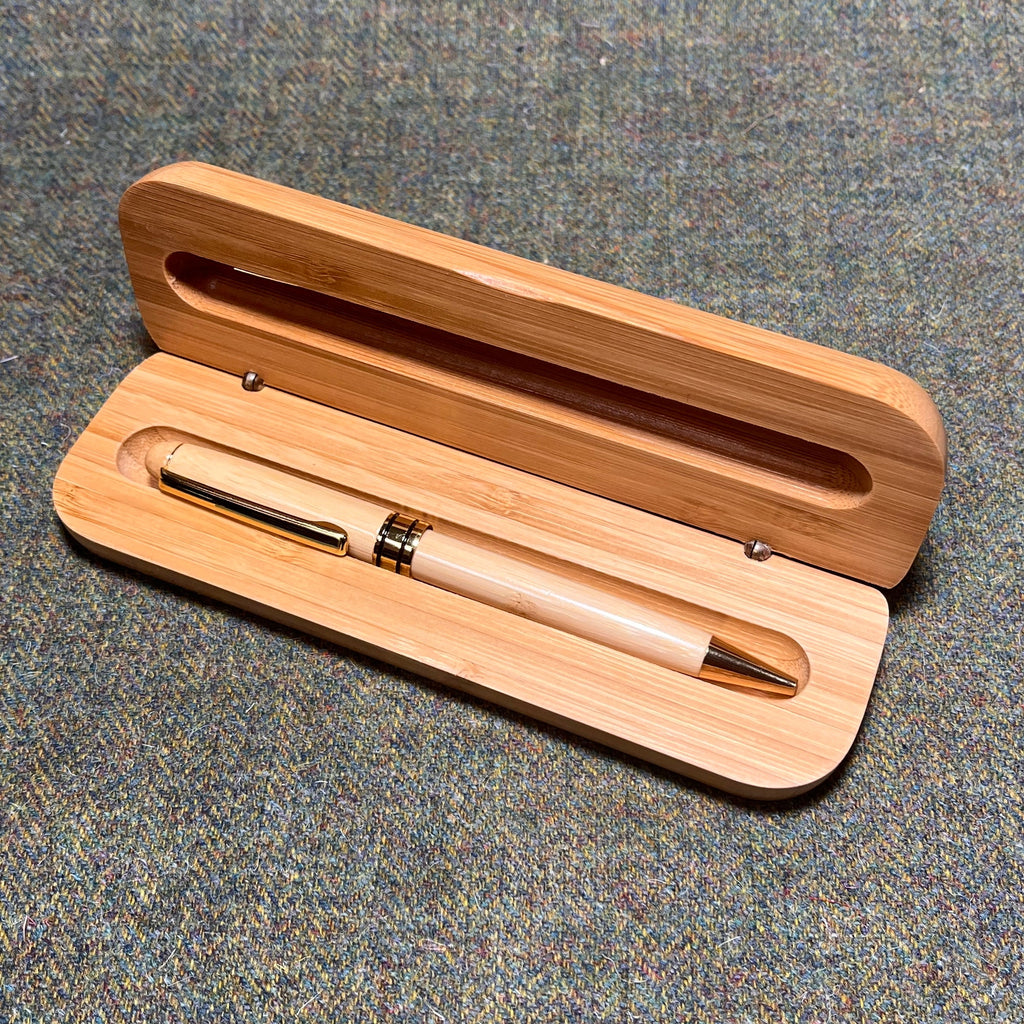 Natural bamboo pen case with your choice of clan crest laser engraved on the lid. Matching bamboo pen (not engraved). Choose from any clan Spelling variations are available please let us know when you place the order.
